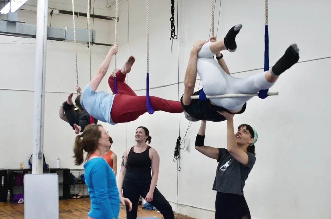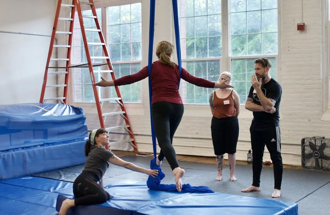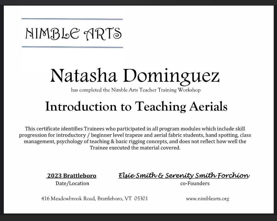 In June 2023, Natasha completed the Intro to Teaching Aerials certification through Nimble Arts at the New England Center for Circus Arts in Brattleboro, VT. Since then, she has taught group classes, led private lessons, and facilitated specialty workshops, including Hoop in Heels and an Aerial Coffin workshop featuring a custom-built coffin-shaped apparatus. Whether in class or workshop settings, Natasha emphasizes clean technique, body awareness, and seamless transitions to help students unlock their personal flow.